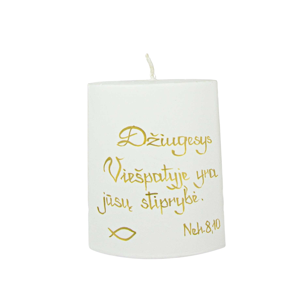 Ovalo formos žvakė su citata iš Biblijos. Degimo laikas 20h.
